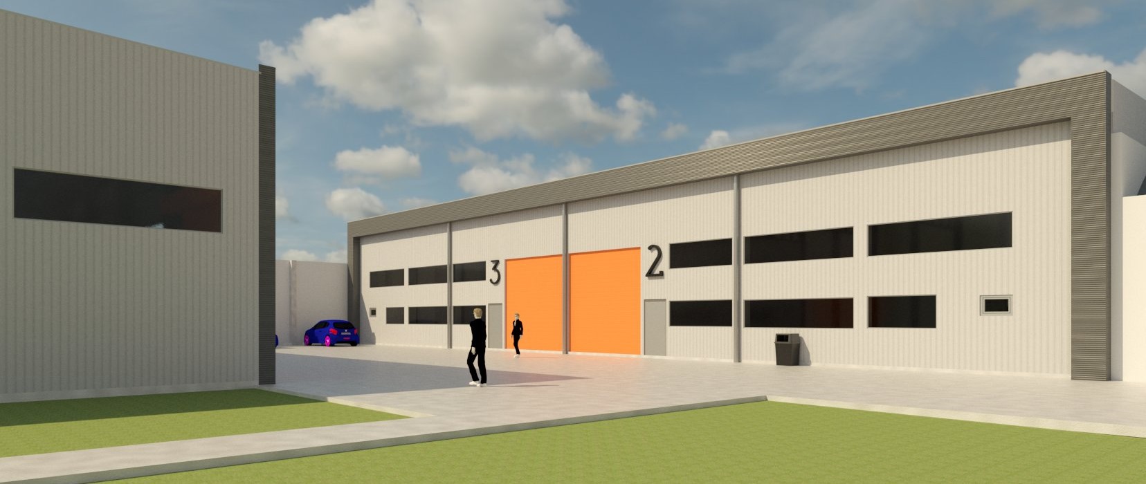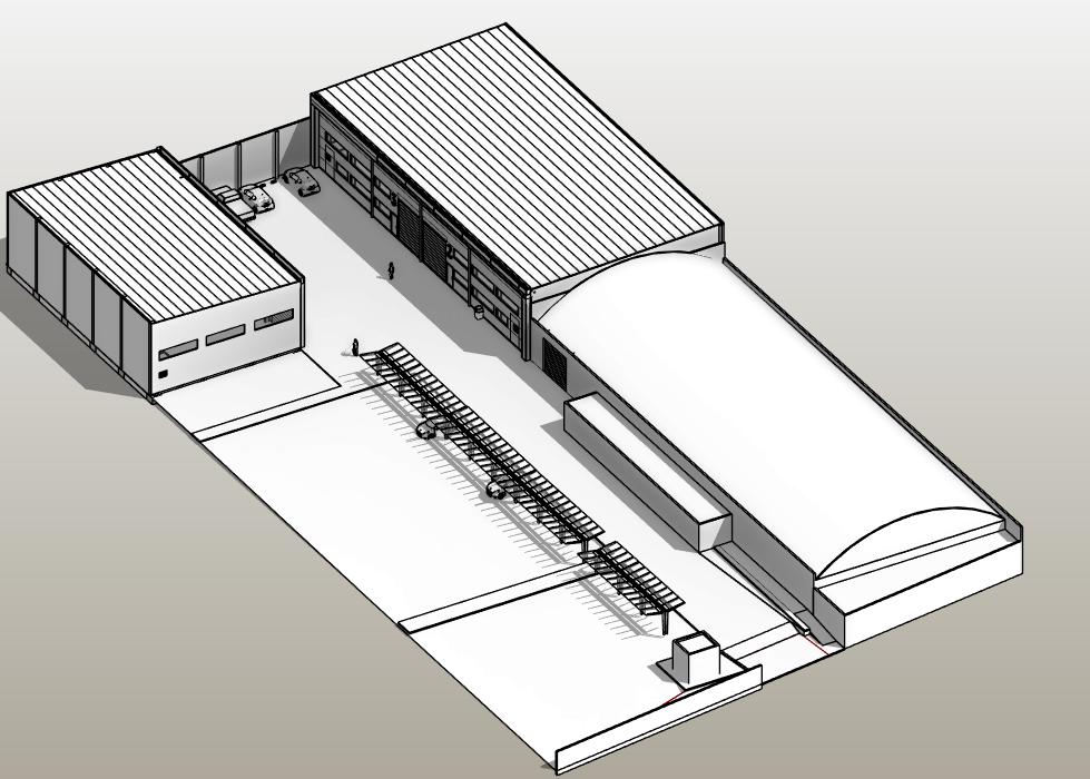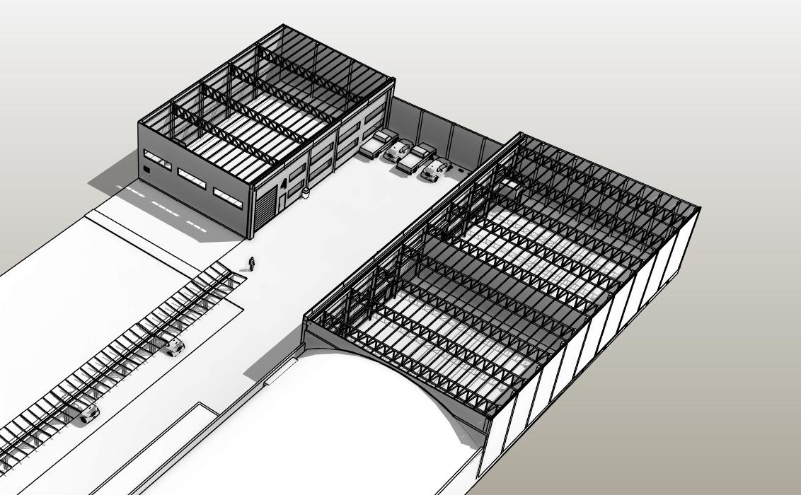 El propietario nos encarga proyectar un «Mini parque industrial». Resolvemos una estética unificada, priorizando las circulaciones de maquinarias y camiones dentro del predio.